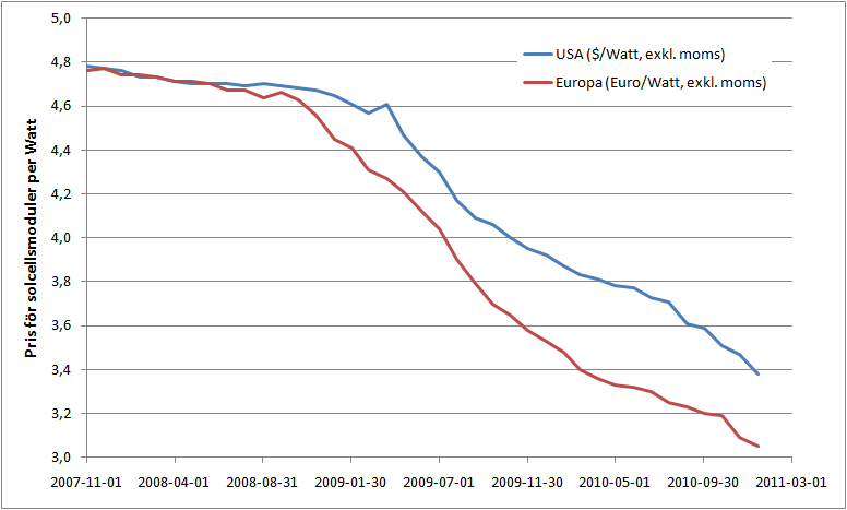 På Solarbuzz hemsida kan man se statistik över genomsnittliga priser till slutkunder för solcellsmodulerna, se nedanstående diagram (klicka på det för att se det i större skala). Priserna är för enstaka moduler med 125 W eller högre effekt, exklusive moms. Det intressanta är trenden för priset. Under de två senaste åren har priset sjunkit stadigt i en relativt hög takt. Efterfrågan på solcellsmoduler förväntas öka betydligt mindre under 2011 än under fantastiska 2010. Solarbuzz tror därför att solcellsmodulernas pris kommer att fortsätta att sjunka under 2011 eftersom ny produktionskapacitet kommer i drift och att konkurrensen därmed ökar.